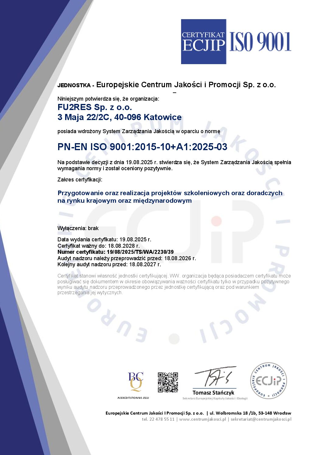 Jakość naszych szkoleń potwierdza także certyfikat ISO9001:2015